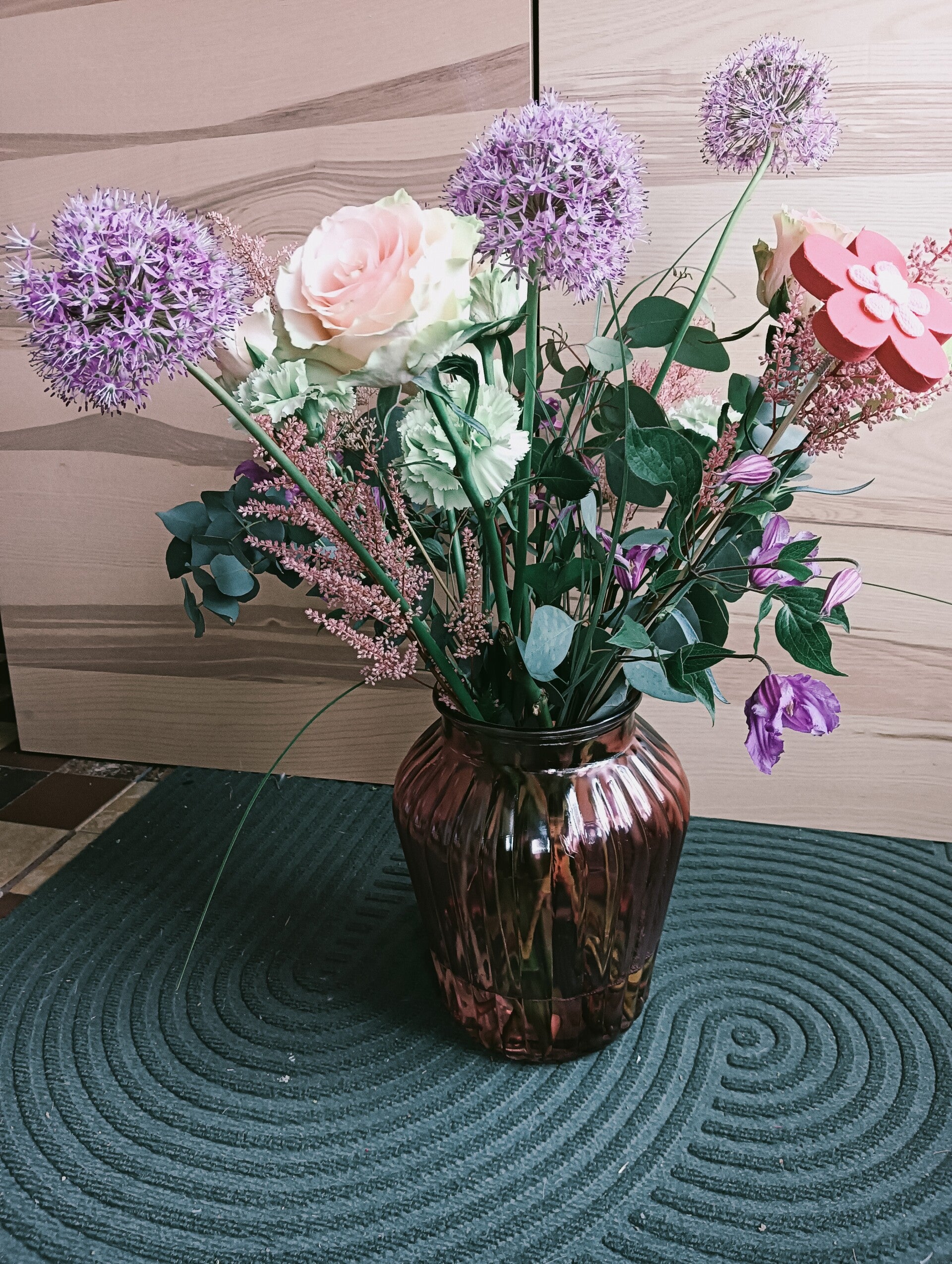 Dit boeketje op vaas,is een voorbeeld,de keuze van de bloemen kan aangepast worden naar eigen keuze.
